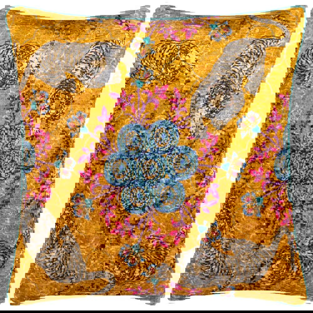 The Wylder Tropics Tigerscope Piped Velvet Cushion Cover in gold is designed to refresh your soft furnishings with a bold printed look. Featuring a floral design with a tiger motif, it brings pattern and colour to sofas, armchairs or beds, while the square shape makes it easy to layer with other cushions.