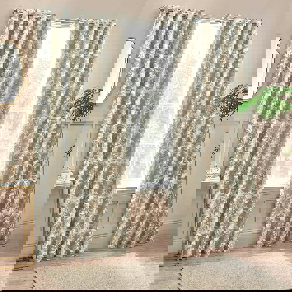 The tapestry-inspired design features a woodland theme with trees and tropical detailing, adding pattern and interest while keeping the overall look natural and versatile. With stainless steel eyelet holes, they are easy to hang, making them a practical choice for refreshing a room with minimal effort.