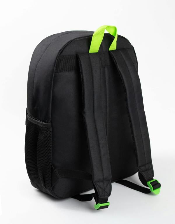 This sturdy zip-up rucksack is designed with a vibrant 'Game On' print and striking green accents, making it a practical item for carrying books and supplies