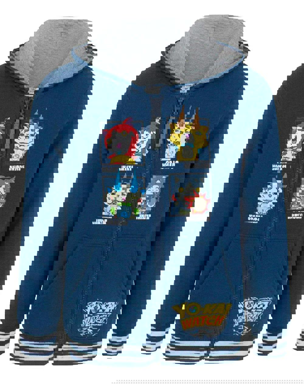 Four panels in the centre of the hoodie feature fan-favourite Yo-Kai Jibanyan, Komajiro, Komasan, and Robonyan in crisp colour and detail, while the Yo-Kai Watch logo is seen on the right hoodie pocket