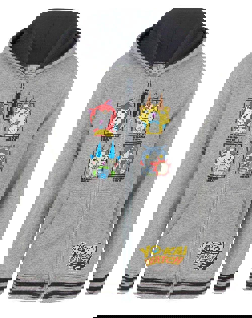 Four panels in the centre of the hoodie feature fan-favourite Yo-Kai Jibanyan, Komajiro, Komasan, and Robonyan in crisp colour and detail, while the Yo-Kai Watch logo is seen on the right hoodie pocket