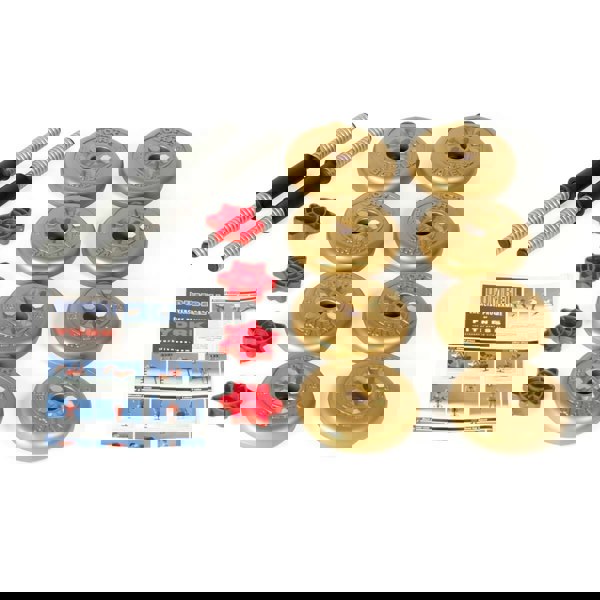 The total weight of the set including the dumbbell bars and collars is 11kg. The adjustable design allows for versatile workouts to target both the upper and lower body. Whether your goal is to build muscle, tone or increase strength, the York vinyl dumbbell set can help you get there.