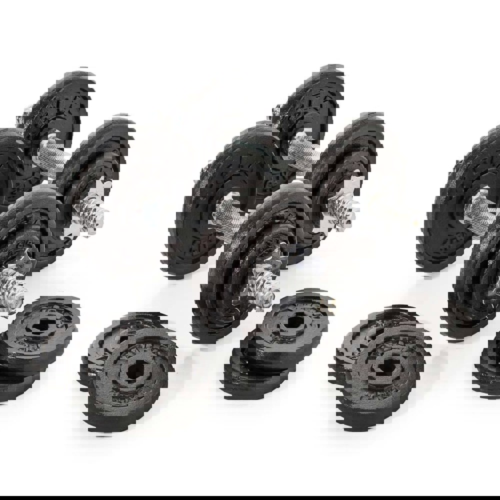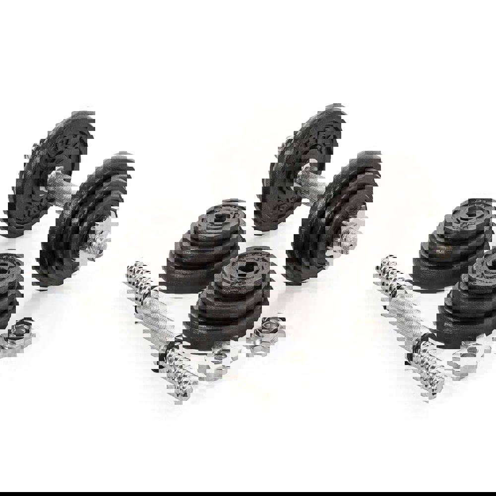The York 20kg Cast Iron Dumbbell Spinlock Set comes complete with 2 x 14” chrome dumbbell bars, 4 x premium heavy duty spinlock collars and 12 x cast iron weight plates (4 x 0. 5kg, 4 x 1. 25kg, 4 x 2. 5kg). It is perfect for adding resistance to home workouts for muscle building, strength work, fat loss and general fitness training. Highly versatile, the dumbbells can be used to perform a huge range of exercises to hit the upper and lower body.