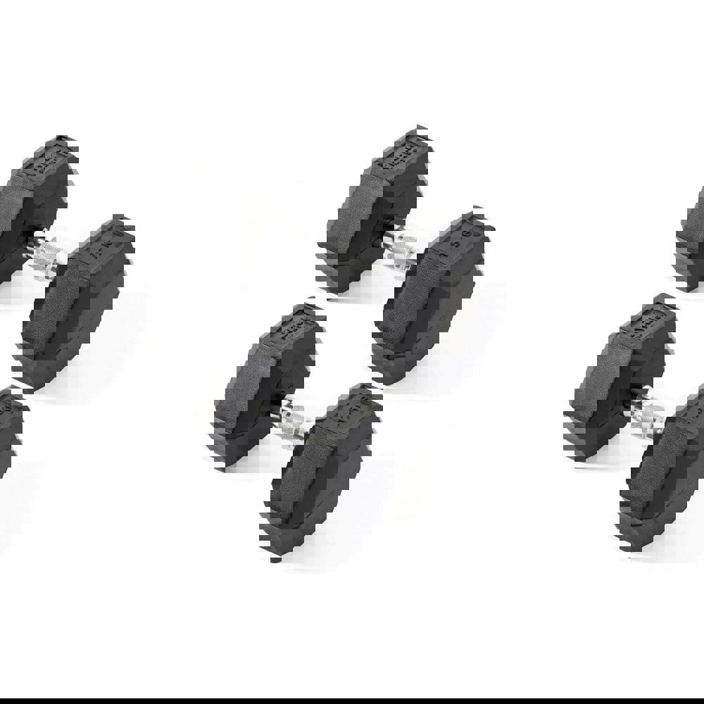 The York Fitness 17. 5kg Rubber Hex Dumbbells are perfect if you want a heavier weights for your home training. Ideal for for burning calories, adding intensity and strengthening upper and lower body muscles, these dumbbells are made with a hexagonal design which means they won't roll away when you put them down. The chrome-plated knurled handles offer a superior grip throughout your training session and the heavy duty rubber-encased heads help protect your floor surface. The 17. 5kg dumbbells are sold as a pair.