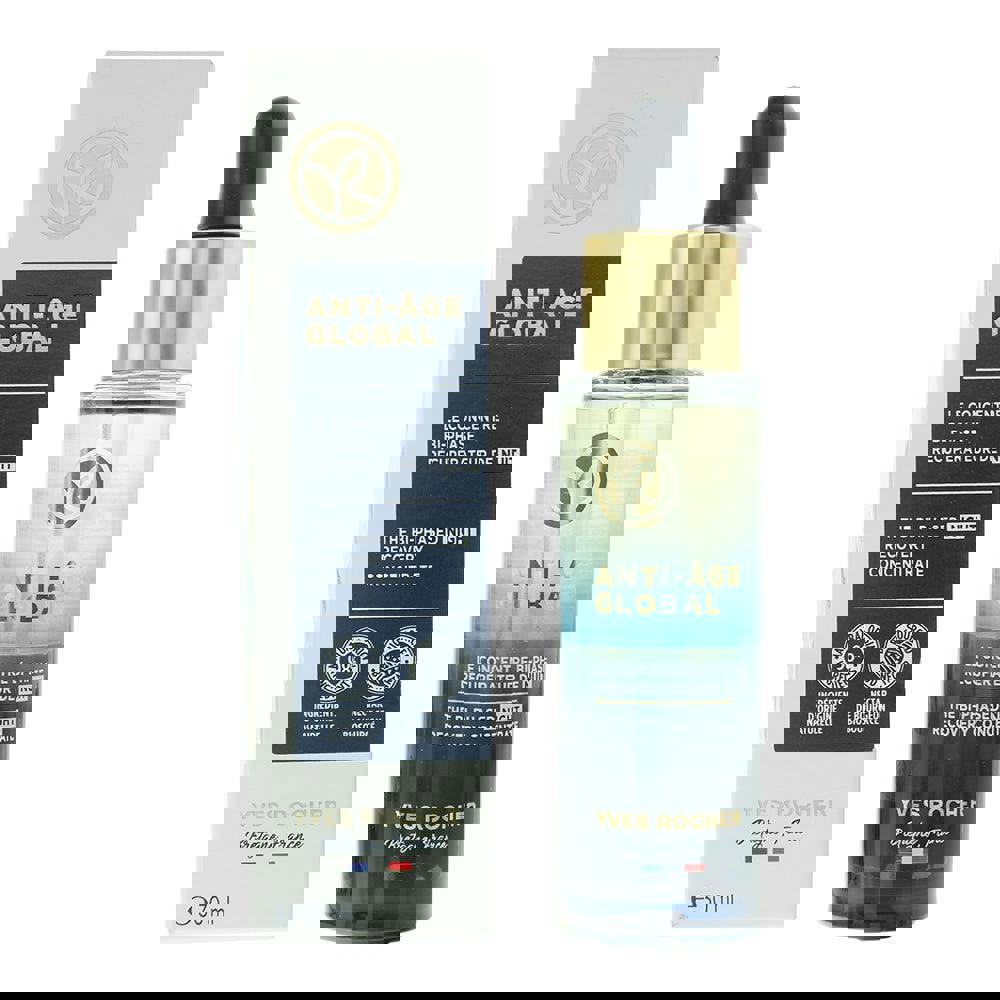 Yves Rocher Anti Age Global The Bi-Phased Night Recovery Concentrate Serum is a night serum presented in a bi-phased concentrate format. It is intended for evening use as part of a skincare routine and comes in a 30ml size.