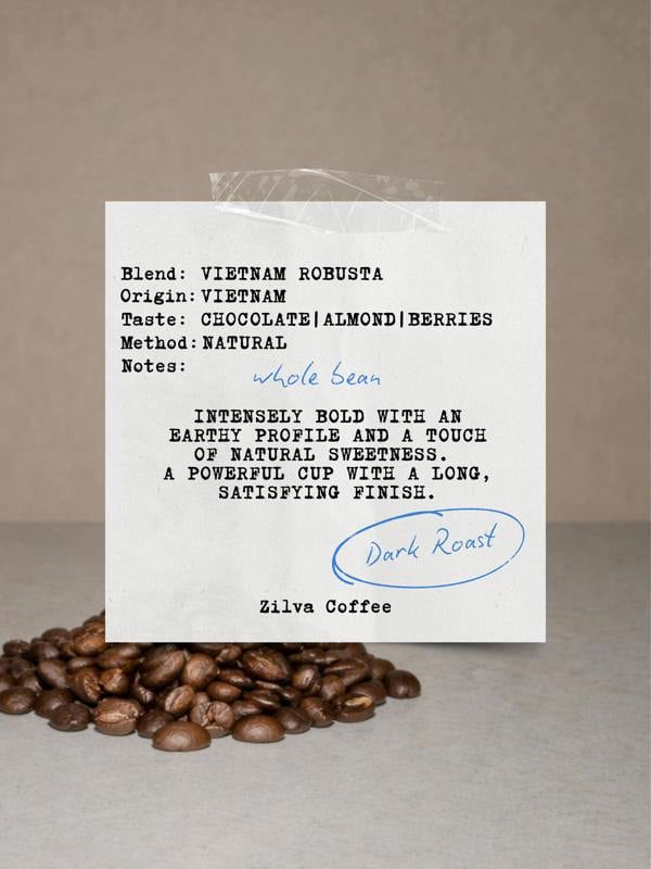 This deeply rich dark roast, crafted entirely from 100% Robusta beans, hails from Vietnam — naturally processed - delivering bold, full-bodied flavor with distinctive notes of chocolate, almond, and dark berries.