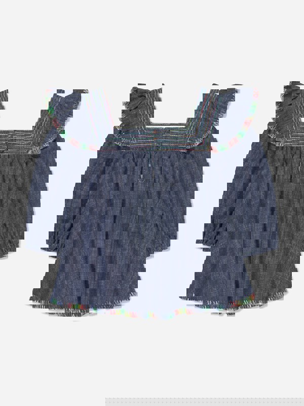 Zimmermann brings signature detailing to this Alight denim blouse in blue. Made from pure cotton, it is finished with multi-hued embroidered trim for a distinctive look. A square collar frames the neckline, while flounced shoulder trim and puff sleeves add shape and volume. An embroidered bee logo sits above the hem for a subtle branded touch. Button fastening on the reverse completes the design.
