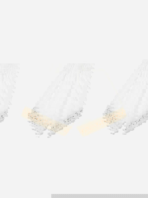 Zimmermann girls Wylie trimmed shorts in ivory. Made from 100% cotton, this pair is finished with crochet trim at the hem in a pearly white colour. An elasticated drawstring waistband provides an adjustable fit, while an embroidered edge completes the detailing.