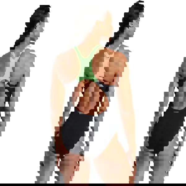 The Alloy Actionback Swimsuit from Zoggs is designed with a graphic digital print in neon green on a chic background of black. Featuring wide straps and a shelf bra, it offers great support while the open back provides freedom of movement for the shoulders in the water. Made from eco-friendly Ecolast+ fabric, this swimsuit is quick-drying, durable and 100% chlorine resistant.