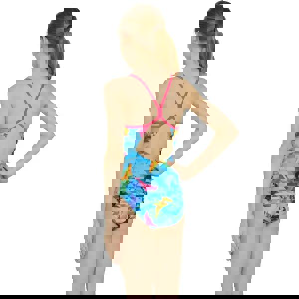 The Girls Dolphine Sprintback Swimsuit from Zoggs is an ideal swimwear for regular swimming sessions and training. Featuring colourful geometric fishes on a background of blues and greens, the sprintback thin straps in bright pink, ensure comfort and freedom of movement. There is a front lining that provides moderate support while swimming and it's made from chlorine-resistant Ecolast fabric and has chlorine resistance and great shape retention.
