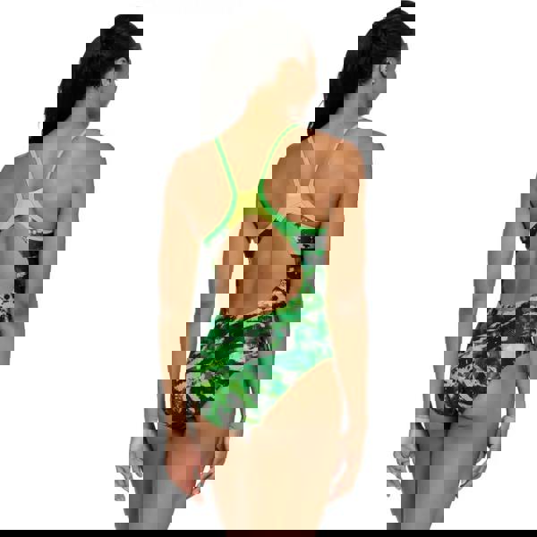 Designed for swimmers seeking both performance and style, the Greengame Strikeback Swimsuit from Zoggs delivers versatility for training and recreational swimming alike. Its open back construction with reinforced central support maximises freedom of movement, while the medium leg cut offers practical coverage. The striking fractal design in greens contrasts beautifully against a black base, complemented by vibrant green straps and yellow accents. Crafted from Ecolast+ fabric, this swimsuit resists chlorine degradation and maintains its shape through repeated use, making it a reliable choice for regular swimmers.