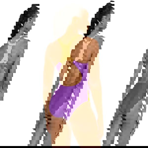 Engineered for serious swimmers, the Jazzy Powerback Swimsuit from Zoggs features an abstract, bubbly pattern to the front in shades of purple, pink and greens. Its reinforced crossback straps in apricot, provide exceptional shoulder support during rigorous training sessions. The shelf bra construction offers subtle bust support without bulk, complemented by a lined gusset for comfort and durability. Cut with a medium leg length for versatile styling, this one-piece is constructed from Ecolast+ fabric—a sustainable choice featuring superior chlorine resistance, colour fastness, and integrated UPF50+ protection. Ideal for lap swimmers and regular pool users seeking reliable performance and environmental responsibility.