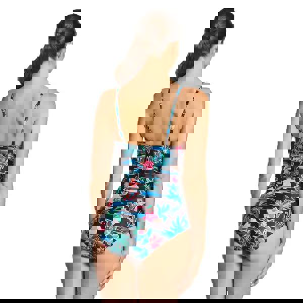 The Retro Surf Ruched Bandeau Swimsuit from Zoggs features a flattering ruched front in a beautiful multi-coloured pattern of bright tropical flowers on a background of black. Perfect for swimming or sunbathing, it features supportive foam cups, a low leg height, front lining and flattering ruching on the front panel. It also has useful, adjustable, removable thin straps for a perfect tan, you can also wear them straight or crossed at the back for extra support.