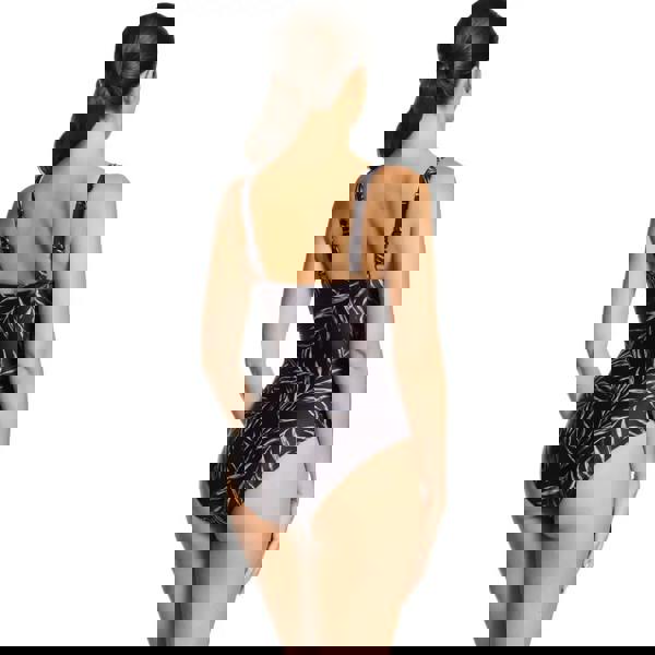The Safari Leaf Adjustable Classicback Swimsuit from Zoggs is a stylish black swimsuit featuring a stylish all over pattern of tropical leaves in white. The classicback has a high back with adjustable straps to help give you a perfect fit, a slightly rounded front with wider straps, foam cups and front lined for extra support, and a medium leg height for modest coverage. Made from durable Ecolast+ fabric, the swimsuit is 100% chlorine-resistant and has great shape retention.