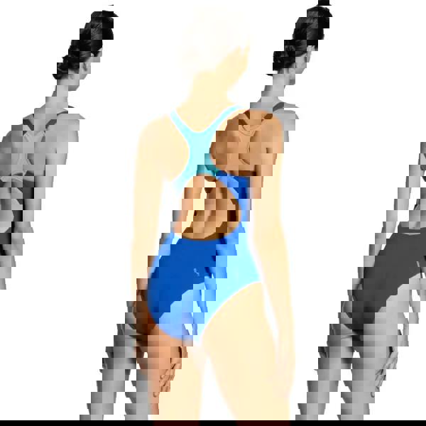 The Spinal Powerback from Zoggs is a classic swimsuit, perfect for frequent swimming and training with supportive wide straps. Featuring a dynamic pattern to the front of the swimsuit in bright blues, there are crossback straps at the back in aqua blue. This flattering one-piece has a medium leg, a shelf bra bust lining for light support and a lined gusset. Made from Ecolast+ fabric for great colour retention, chlorine resistance and UPF50+ sun protection, made from recycled plastic bottles.