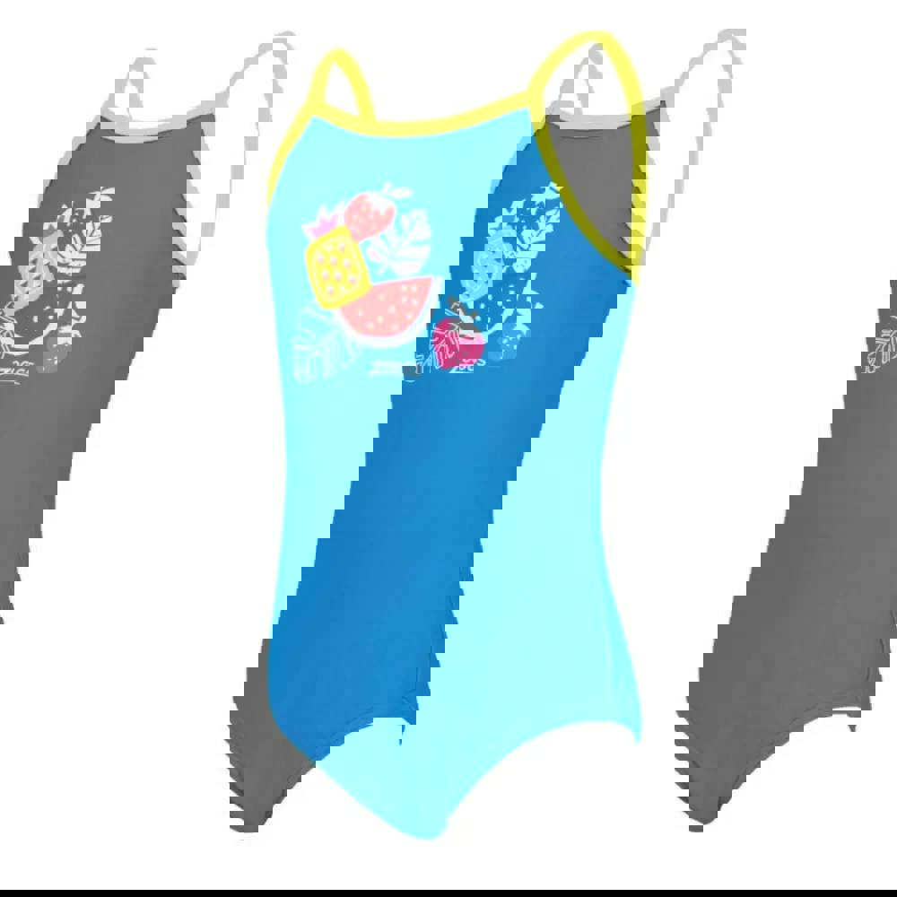 The Tots Girls Pool Party Classicback Swimsuit from Zoggs offers a fun fruity print showcasing a mixture of Watermelon, Pineapple and Strawberries on a contrasting blue base with lime piping straps. This swimsuit shines with vibrant colours and is great for days by the pool.